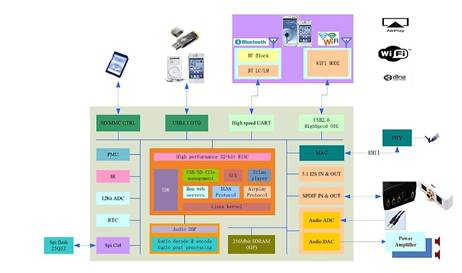 該芯片集成了2.0 High SpeedUSB控制器(內置PHY), SD/MMC/SDIO控制器,100M以太網,高速UART,Audio ADC和DAC,5.1 I2Sin/out和SPDIF in/out等音頻接口,內置了RTC,A/D模塊和UART/SPI Master/I2C/PWM接口,并采用先進的SMIC 0.11G工藝,100-PIN LQFP封裝,疊封SDRAM,非常適合音樂播放、無線推送和音效處理等多方面的應用。應用信息如下圖所示: