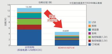本產(chǎn)品利用ROHM多年積累的汽車音響用系統(tǒng)電源的技術(shù)訣竅,實現(xiàn)了以高效 DC/DC轉(zhuǎn)換器為中心的最佳電源系統(tǒng)。本產(chǎn)品的推出使ROHM以往產(chǎn)品13.3W的運行功率降低到4.66W,成功地降低功耗65%左右。作為汽車音響用系統(tǒng)電源IC,實現(xiàn)了 業(yè)界最低的運行功率。