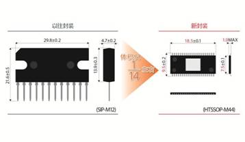 本產(chǎn)品通過采用DC/DC轉(zhuǎn)換器并優(yōu)化電源結(jié)構(gòu),使發(fā)熱量更低,實現(xiàn)了僅PCB板即可散熱的表面貼裝封裝(HTSSOP-A44)。由此,不再需要散熱板,與ROHM以往的產(chǎn)品相比,體積僅為1/14左右,有助于減少組裝工時,并進一步節(jié)省系統(tǒng) 內(nèi)部空間,降低設(shè)計負擔(dān)。