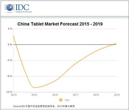 IDC最新發(fā)布的《中國平板電腦市場季度跟蹤報告,2015年第三季度》顯示,2015年第三季度中國平板電腦市場出貨量為621.5 萬臺,同比下降17.8%。IDC 預(yù)計2015年第四季度平板電腦市場出貨量為672.3萬臺,同比下降 9.8%。2015年全年降幅將達10.9%。