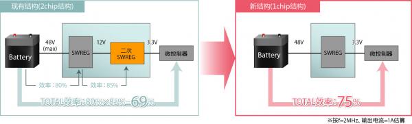 然而,要驅(qū)動(dòng)一般的車載用MCU和控制系統(tǒng),需要可從48V直接降壓到3.3V或5V的高降壓比電源IC,而這種電源IC又不存在,因此只能生成12V等中間電壓通過二段式降壓來解決。而另一方面,為了防止對(duì)無線電頻段的影響,又要求2MHz以上的高頻工作。
