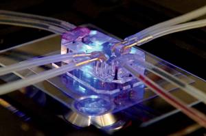 Wyss研究所采用制作計(jì)算機(jī)芯片的技術(shù),將活的人體器官細(xì)胞植入到芯片中,同時(shí)芯片可以模擬細(xì)胞在人體內(nèi)的環(huán)境。一個(gè)器官芯片的體積與一個(gè)閃盤相當(dāng),由柔性的半透明聚合物制成。在芯片的槽道中有三個(gè)并列的流體通道,兩邊的通道是真空通道,中間的通道是植入細(xì)胞的通道。直徑小于一毫米的通道與從人體器官上提取的細(xì)胞相連,可以在芯片內(nèi)復(fù)雜的管道中流動(dòng)。當(dāng)營(yíng)養(yǎng)物質(zhì)、血液、需要測(cè)試的化合物,如實(shí)驗(yàn)性藥物從微流管中泵入時(shí),這些器官的細(xì)胞能復(fù)制一些活體器官的關(guān)鍵功能。