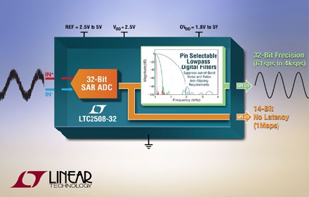 凌力爾特公司 (Linear Technology Corporation) 推出超高精度 32 位逐次逼近寄存器 (SAR)型模數(shù)轉(zhuǎn)換器 (ADC) LTC2508-32。許多高性能應(yīng)用 (包括數(shù)據(jù)采集、工業(yè)控制和醫(yī)療儀表) 均要求準(zhǔn)確度和速度。這通常是通過在同一個系統(tǒng)中采用一個高分辨率 ΔΣ ADC 和一個高速 SAR ADC 來實現(xiàn)。LTC2508-32 通過同時提供一個 32 位低噪聲數(shù)字濾波輸出和一個 14 位 1Msps 無延遲輸出簡化了此類混合 ADC 系統(tǒng)設(shè)計。由于這些輸出是從單個 32 位 SAR ADC 內(nèi)核產(chǎn)生,因此高準(zhǔn)確度和高速輸出是完全匹配的,即使當(dāng)工作溫度、電源和應(yīng)力變化時也不例外。與使用兩個極度不匹配 ADC 的傳統(tǒng)解決方案截然不同,LTC2508-32 中準(zhǔn)確度和速度的獨特組合實現(xiàn)了高得多的系統(tǒng)性能,同時縮小了解決方案尺寸并減少了組件數(shù)目。