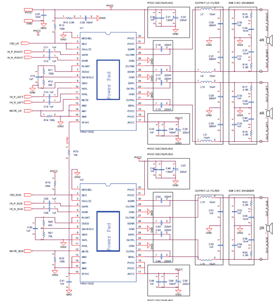 The TPA3116D2 is a 50-W (per channel), efficient, stereo, digital-amplifier power stage for driving two bridge-tied speakers or a single parallel bridge-tied load. The TPA3116D2 can drive a speaker with an impedance as low as 3.2 Ω (4 Ω typical).