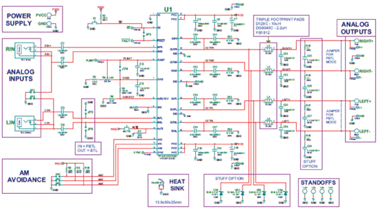 TI公司的TPA31xxD2系列是立體聲高效數(shù)字功率放大器,能驅(qū)動2歐姆揚聲器高達(dá)100W.工作電壓4.5 V – 26 V,效率大于90%,TPA3130D2的高效率可采用單層PCB,不用散熱器提供2x15W輸出功率, TPA3118D2采用雙層PCB, 不用散熱器提供2x30W/8歐姆輸出功率, TPA3116D2采用小型散熱器可提供2x50W/4Ω輸出功率,主要用于小/微型元件的條形音箱,后市場汽車電子,CRT TV和消費類音頻.本文介紹了TPA31xxD2主要特性,方框圖, 應(yīng)用電路圖以及評估板TPA3116D2EVM主要指標(biāo),電路圖,材料清單和PCB布局圖.