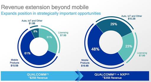 兩家公司的專業(yè)強項具有廣泛的互補性。例如,恩智浦在安全支付系統(tǒng)、物聯(lián)網(wǎng)(IoT)與車用半導體解決方案等方面擁有強大的市場位,而高通則是智能手機產(chǎn)業(yè)的主要芯片供貨商,而這也是恩智浦從未真正取得成功的領域。