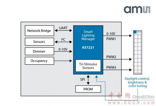 AS7221配備了一個行業(yè)首創(chuàng)的嵌入式三刺激CIE XYZ色彩傳感器,通過直接映射到CIE 1931色彩空間實現(xiàn)精確的色彩感應。這種智能照明管理器是一種全集成的照明控制系統(tǒng),與標準的0-10V輸入兼容,通過標準的客戶端(如智能藍牙、ZigBee協(xié)議或WiFi)和完整的智能照明命令集實現(xiàn)物聯(lián)網(wǎng)連接和網(wǎng)絡控制,通過直接的PWM通道輸出實現(xiàn)LED光譜調(diào)諧控制,打造出高精度的解決方案。與更為笨重的分立元件方法相比,這種方案可顯著降低開發(fā)和集成時間。