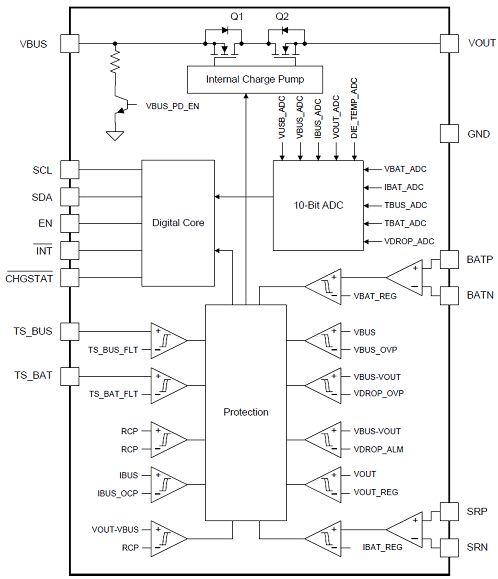 The integrated 10-bit ADC can measure input voltage and current, battery voltage and current, as well as battery temperature and input connector temperature. This allows the user application to continuously monitor the power input and battery charging parameters to ensure the safety of the battery charging. The flexible OVP and OCP thresholds for VBUS, VOUT, and battery can be modified via I2C registers as the battery goes through constant current (CC) and constant voltage (CV) mode.