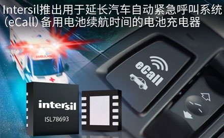 Intersil公司(納斯達(dá)克交易代碼:ISIL)今天宣布,推出可延長汽車自動緊急呼叫(eCall)系統(tǒng)中使用的磷酸鐵鋰(LiFePO4)電池續(xù)航時間的3.6V單芯電池充電器---ISL78693。ISL78693電池充電器的漏電流是競爭產(chǎn)品的四分之一(3uA),可延長eCall系統(tǒng)備用電池的供電時間。Intersil將于2017年1月18-20日在日本東京國際汽車技術(shù)展(Automotive World)E30-11號展位展示ISL78693。