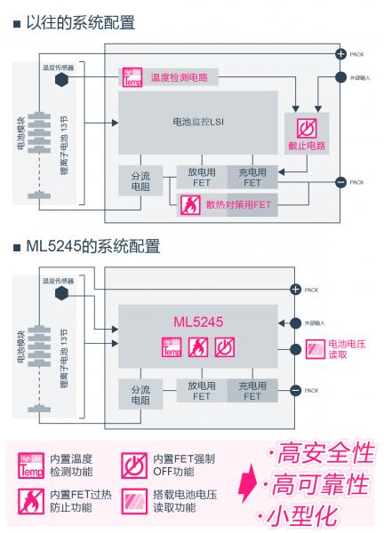 作為其應(yīng)對措施,以往是通過對電池監(jiān)控LSI增加外圍電路的形式來確保電池組的安全,而新開發(fā)的ML5245集成了這些外圍電路功能,從而可實現(xiàn)系統(tǒng)的小型化與更高可靠性,并進一步提高電池組的安全性。