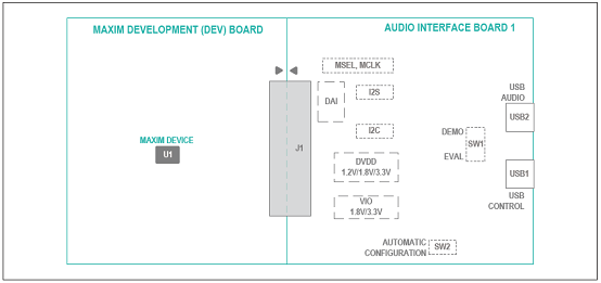 The Maxim Audio Interface 1 (AUDINT1) board providesboth an I2C and I2S interface to facilitate the evaluationof compatible Maxim Development (DEV) boards. MaximDEV boards that are evaluated with the AUDINT1 interfaceboard can require custom GUI software, which is availableas a download from Maxim’s evkit-software web page.