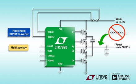 亞德諾半導(dǎo)體 (Analog Devices, Inc.,簡稱ADI) 旗下凌力爾特公司 (Linear Technology Corporation) 推出大功率固定比例充電泵 DC/DC 控制器LTC7820,該器件在非隔離式中間總線轉(zhuǎn)換器中無需功率電感器,從而可將電路尺寸減小多達 50%,并提供高達4000W/in3的功率密度。LTC7820 在分壓器、倍增器或反相器配置中以高達 99% 的效率驅(qū)動外部 MOSFET。其開環(huán)固定占空比是非常適合配電、數(shù)據(jù)通信、電信、高端計算和工業(yè)系統(tǒng)中的非隔離式中間總線應(yīng)用。