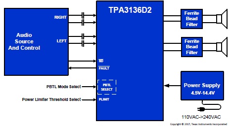 借助采用擴展頻譜控制方案的高級 EMI 抑制技術,既能實現在輸出端使用成本較低的鐵氧體磁珠濾波器,同時能夠滿足 EMC 要求,降低了系統成本。TPA3136D2/TPA3136AD2 器件不僅針對短路和過載提供全面的保護,而且 SpeakerGuard™揚聲器保護電路包括一個功率限制器和一個直流檢測電路,可以保護所連接的揚聲器。直流檢測及引腳至引腳、引腳接地和引腳至電源短路保護電路可以防止揚聲器在生產過程中發(fā)生輸出直流和引腳短路。同時充分保護輸出,防止 GND、PVCC、輸出至輸出短路。短路保護和熱保護具有自動恢復功能。