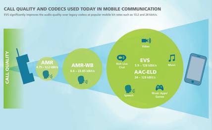 繼AMR-WB之后的下一代3GPP VoLTE編解碼器---增強型語音EVS, 可為手機用戶提供全高清語音通話質(zhì)量。聽Fraunhofer IIS的技術(shù)人員講,EVS除了顯著提升了語音通話服務(wù)質(zhì)量外,還支持全高清語音超寬帶語音編碼范圍從5.9-128kBit/s的比特率,而AMR-WB的速率為6.6-23.85kBit/s;可完美應(yīng)用于超寬頻VoLTE/VoWiFi服務(wù)中,且是唯一指定的編解碼器;配合EVS先進的魯棒性和抗丟包功能,樓宇室內(nèi)信號覆蓋能得到了顯著提升。說到這里小編已身在體驗區(qū)試聽,不得不說,相比AMR和AMR-WB,在同一頻率下,EVS有著大踏步的跨越,聲音清晰到可以讓你感受得到對方的心跳。