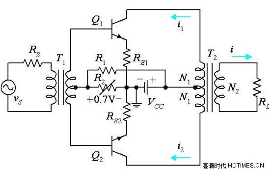AB類功率放大器(Class AB)也成為甲乙類功率放大器,它是兼容A類與B類功放的優(yōu)勢的一種設(shè)計(jì)。當(dāng)沒有信號或信號非常小時(shí),晶體管的正負(fù)通道都常開,這時(shí)功率有所損耗,但沒有A類功放嚴(yán)重。當(dāng)信號是正相時(shí),負(fù)相通道在信號變強(qiáng)前還是常開的,但信號轉(zhuǎn)強(qiáng)則負(fù)通道關(guān)閉。當(dāng)信號是負(fù)相時(shí),正負(fù)通道的工作剛好相反。