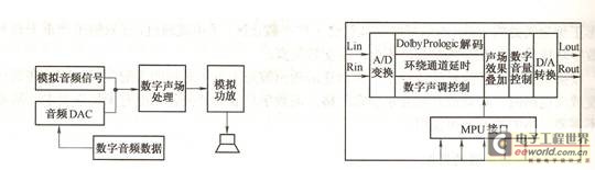 所謂的“數(shù)字化”功放只是在前置級(jí)上采用數(shù)字信號(hào)處理的方式,在模擬音頻信號(hào)或數(shù)字音頻信號(hào)輸入后,采用現(xiàn)有的數(shù)字音頻處理集成電路,實(shí)現(xiàn)一些比如聲場(chǎng)處理、數(shù)字延時(shí)、混響等功能,最后再通過(guò)模擬功率放大模塊進(jìn)行音頻放大。其典型電路框圖如圖2所示。由圖2可知,其各模塊的接口都是采用模擬方式。而數(shù)字聲場(chǎng)處理模塊的大致原理框圖如圖3所示。{{分頁(yè)}}