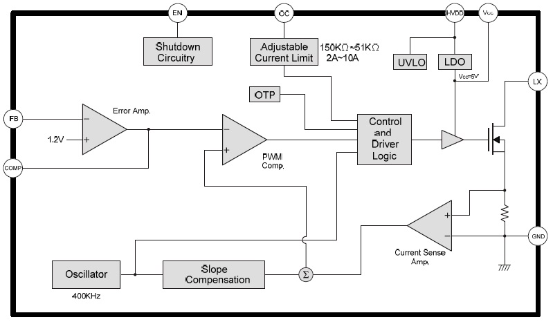 檢測通過LX 與GND 之間MOS 電流,也就是電感峰值電流,觸發(fā)過電流會將佔空比縮小,限制電感電流,輸出電壓也會降低;當佔空比50%以上觸發(fā)OCP,為了讓PWM 穩(wěn)定方波,IC內(nèi)部做斜率補償,佔空比越大OCP 會降低,透過外部電阻R3 調(diào)整OCP,R3 選用參考以下圖表,電阻值150kΩ~51kΩ,OCP 2A~10A,OC Pin 不能空接。