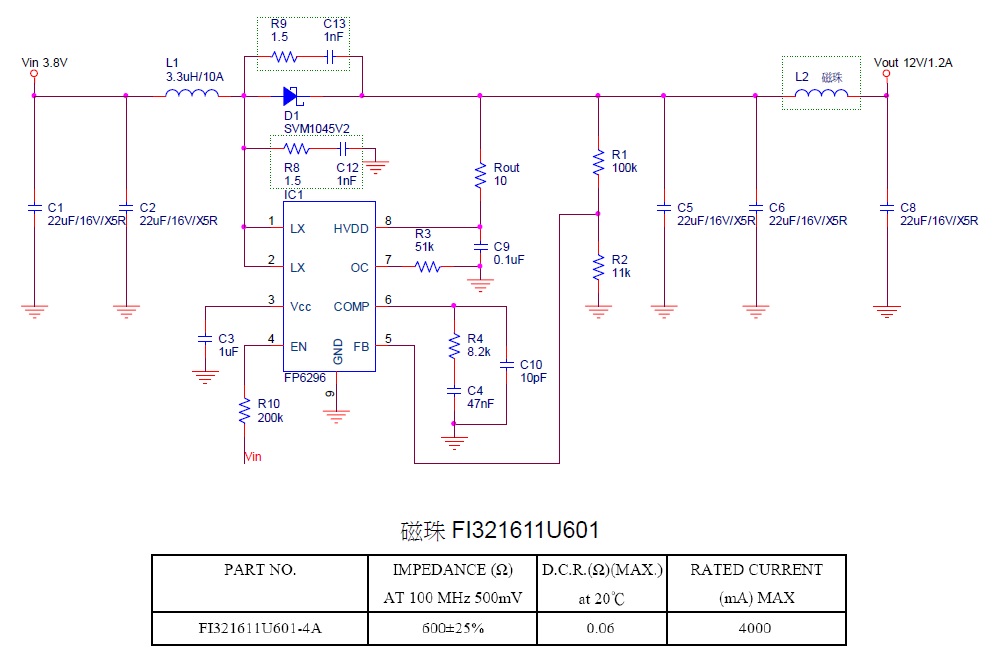 R8,C12 兩者靠近,且靠近LX 與GND Pin;R9,C13 兩者靠近,且靠近D1,輸出電容C5 的地一定要靠近IC 底部散熱片GND Pin,L2 使用磁珠(Bead)參考以下規(guī)格,測試條件鋰電池3.8V升壓12V/1.2A(水泥電阻10Ω),測試結(jié)果垂直與水平都通過;L2 也可以選用電感1μH。