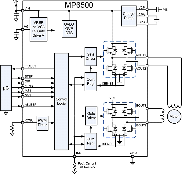 MP6500最大驅(qū)動電流峰值為2.5A(具體取決于封裝和PCB設計);電源電壓范圍從4.5V至35V。 支持整步,半步,四分之一步,八分之一步驅(qū)動模式。不需要外部電流檢測電阻,只需要一個接地的小型、低功耗電阻去設定繞組電流峰值。