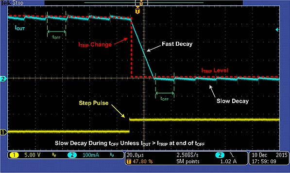 通常情況下, MP6500工作在慢衰減模式下。然而,當一個固定關斷時間結(jié)束,慢衰減結(jié)束后,如果當前繞組電流仍高于預期水平,快衰減模式會被開啟以用來迅速減小驅(qū)動電流到所需值。 這種混合控制模式,使得驅(qū)動電流快速下降到零,同時又保證平均電流盡量接近設定值。 當step跳變時,快衰減就被采用使得當前電流迅速被調(diào)整到零,如圖6所示。