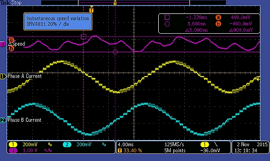 MPS MP6500步進驅(qū)動集成芯片,采用內(nèi)部電流采樣和上述的自動衰減電流調(diào)節(jié)方案,可以實現(xiàn)更好的電機運行質(zhì)量。如圖13所示,速度變化雖不是和模擬正弦和余弦波電流驅(qū)動的結(jié)果一樣小,但是比傳統(tǒng)的驅(qū)動方案要改善許多,使得電機運行更平穩(wěn)安靜,定位更精確。