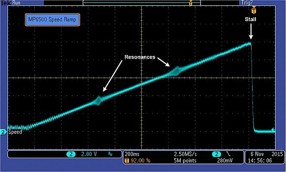 使用相同的設置和繞組電流,如圖15所示,由于更好的自適應電流調(diào)節(jié)控制方案,MP6500可以驅(qū)動明顯更高的速度。失速發(fā)生時,速度測量結(jié)果是在10V左右,相當于在600RPM。