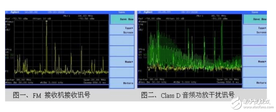 ● 圖一為一般FM接收機(jī)天線端的接收訊號(hào)。當(dāng)D類功放動(dòng)作時(shí),其輻射出來的諧波訊號(hào)如沒有效處理,結(jié)果將如圖二,諧波訊號(hào)覆蓋原有的FM訊號(hào),使FM收訊品質(zhì)下降,甚至無法接收