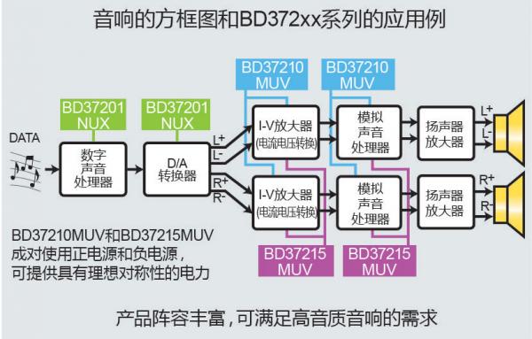產(chǎn)品陣容包括:非常適用于在低電壓下工作的數(shù)字器件(DA轉(zhuǎn)換器、DSP等)的BD37201NUX、非常適用于在高電壓或正負(fù)兩個電源下工作的模擬器件(聲音處理器、電流-電壓轉(zhuǎn)換放大器等)的BD37210MUV(正電源)和BD37215MUV(負(fù)電源)。未來還會在這些產(chǎn)品的基礎(chǔ)上繼續(xù)擴(kuò)充產(chǎn)品陣容,強(qiáng)有力地支持音響設(shè)備的高音質(zhì)化發(fā)展。