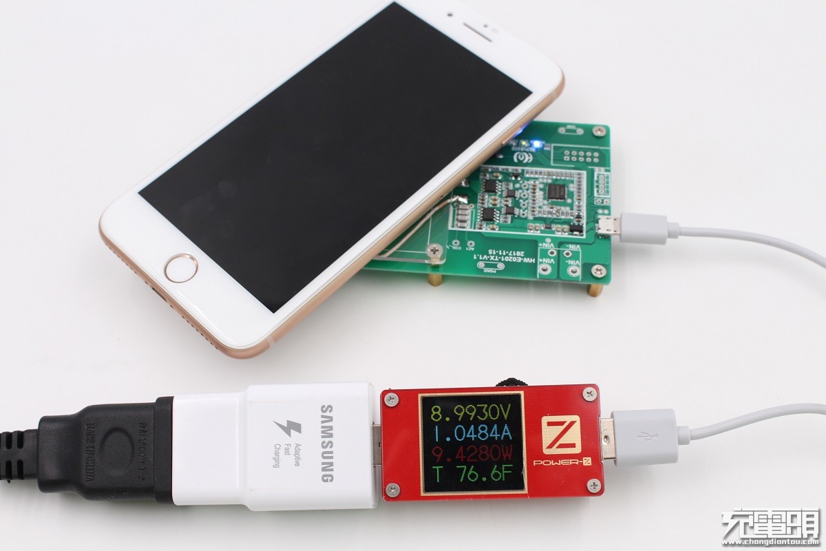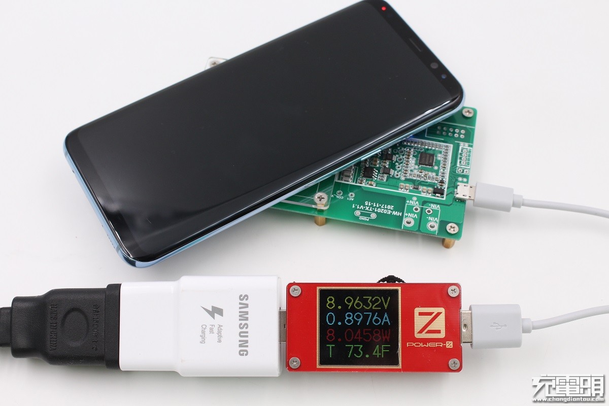 CS4967 DEMO板給三星S8+ (剩余10%電量)實(shí)測,ChargerLAB POWER-Z KT001顯示DEMO輸入端電壓8.96V,電流0.89A,功率8.04W,支持三星S8+無線快充。