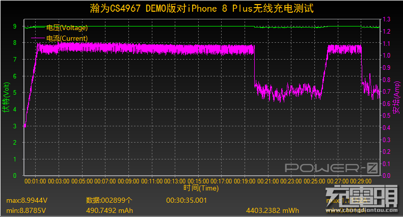 使用CS4967的DEMO板對iPhone 8 Plus(剩余電量20%起)進(jìn)行30分鐘無線充電監(jiān)測,測試工具為ChargerLAB POWER-Z KM001,從截圖可以看到,充電前20分鐘內(nèi),充電電壓穩(wěn)定在9V左右,電流穩(wěn)定在1A以上,期間電流雖出現(xiàn)過波動,但功率仍維持在6W以上。
