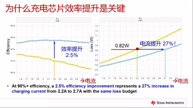 從TI的芯片數(shù)據(jù)來(lái)看,早一代芯片產(chǎn)品是黃色線條,新產(chǎn)品是藍(lán)色線條?梢钥吹,效率差,損耗會(huì)更高,如果效率提高2.5%,在同等的熱損要求下,電流提升可以達(dá)到27%。即基本上1%的效率提升能夠允許10%的電流提升。提高效率,能較大幅度的提升許可充電電流上限,從而帶來(lái)更大的充電設(shè)計(jì)自由度!