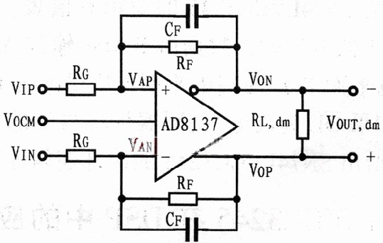 AD8137采用兩個(gè)反饋環(huán)來(lái)分別控制差模和共模反饋。它的差模增益由外部電阻決定,這與傳統(tǒng)放大器一樣。而輸出共模電壓則由一個(gè)受外部Vocm輸入控制的內(nèi)部反饋環(huán)決定。這樣的結(jié)構(gòu)使其可以很容易地任意設(shè)定輸出的共模電壓,而不影響放大器的差模增益。