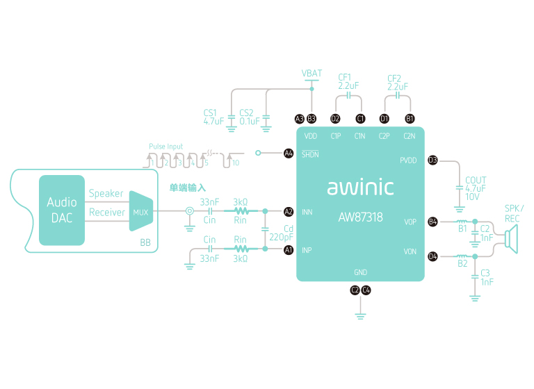 7.0W/2.8V-5.5V(內(nèi)置升壓模塊)/4Ω |