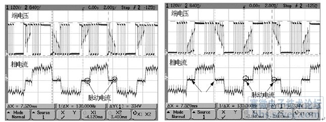 圖4:電磁轉(zhuǎn)矩方程式以及相電流與估算角度的實驗波形。