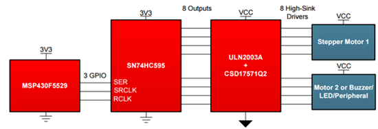 一些電機(jī)、LED和其它設(shè)備可能不會(huì)從作為處理器的內(nèi)部串行接口中受益。這些情況下,可以使用如圖3所示的SN74HC595這一串行到并行轉(zhuǎn)換器。該設(shè)備有助于將數(shù)據(jù)順序傳送到輸出。我選擇這部分用于設(shè)計(jì),因?yàn)樗子谑褂、成本低,并使設(shè)計(jì)人員能夠堆疊或菊花鏈類似設(shè)備。任何諸如SN74HC164或TCA9539在內(nèi)的其它串行到并行設(shè)備也可以幫助完成任務(wù)。