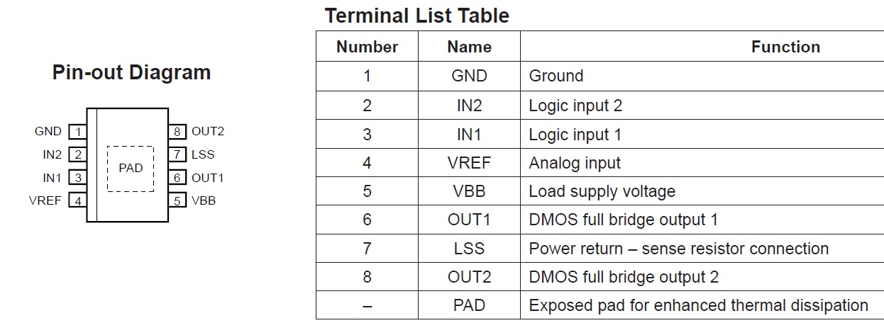 內(nèi)部電路保護(hù)包括過電流保護(hù)、電動機(jī)引腳接地短路或電源短路、帶時延的過熱關(guān)機(jī)、VBB 欠壓監(jiān)視以及交叉電流保護(hù)。