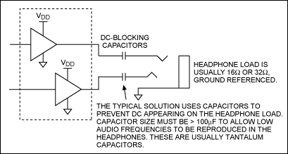 圖1. 該電路是用于單電源產(chǎn)品中耳機(jī)驅(qū)動(dòng)器的典型配置,其中包括串聯(lián)電容,與耳機(jī)阻抗一起構(gòu)成了高通濾波器(為了阻斷來自耳機(jī)的DC所必需的)。