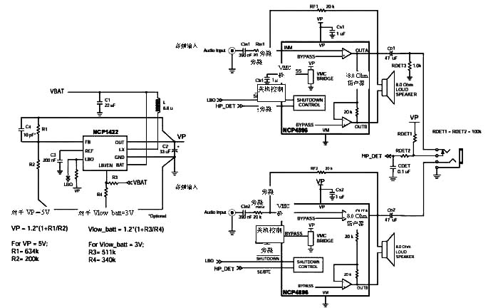 最后,NCP1422具有一個(gè)集成電池電壓過低偵測(cè)器。當(dāng)存在電池且能夠驅(qū)動(dòng)音頻放大器時(shí),可使用此功能啟動(dòng)這些放大器。如果電池電量較低或者電源斷開時(shí),該偵測(cè)器也將自動(dòng)關(guān)閉音頻放大器。電池過低輸出(LBO) 信號(hào)直接連接到NCP4896的關(guān)斷引腳。