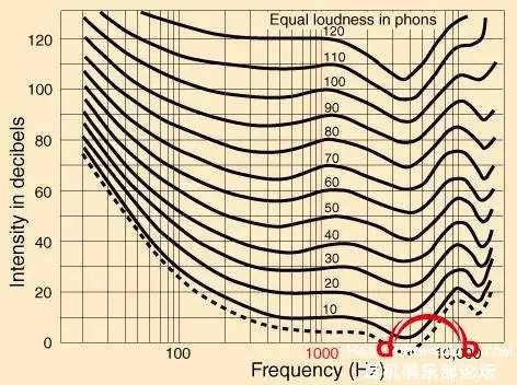 (一)響度(loudness):人主觀上感覺聲音的大。ㄋ追Q音量),由“振幅”(amplitude)決定,振幅越大響度越大。與分貝不同。分貝是人可以區(qū)分的最小的聲音響度的級(jí)差,而響度是人耳朵對(duì)于聲音強(qiáng)弱的主觀感覺,人們對(duì)響度的敏感程度不一樣,所以是將很多人的主觀感覺相綜合的平均值。另外人們對(duì)于相同分貝但不同頻率的純音聽起來感覺響度不同,所以有等響曲線這個(gè)東西,人耳對(duì)于2000-5000Hz的頻率敏感的多。比方說,對(duì)我們一般人類,50分貝100Hz的純音和40分貝1000Hz的純音聽起來一樣響。所以把耳放、播放器音量調(diào)大、調(diào)小,每個(gè)頻率的響度給你的感覺就會(huì)產(chǎn)生變化。下圖就是等響曲線。