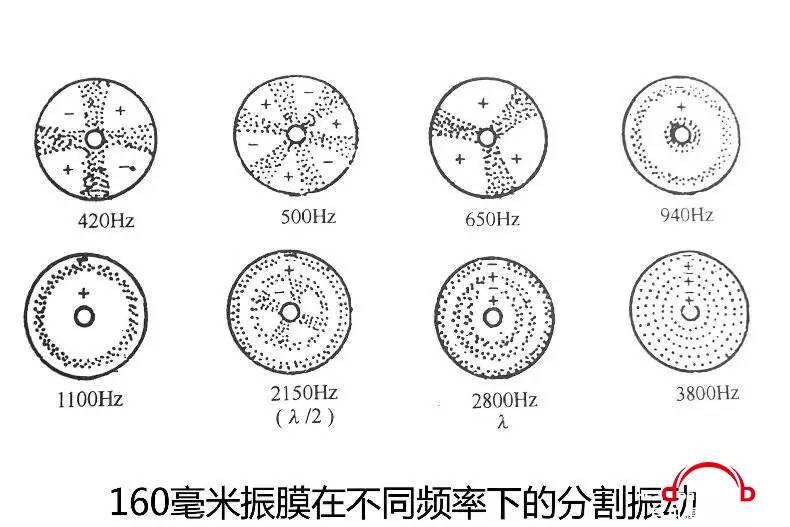 我們先談一下耳機(jī)的阻抗和靈敏度,阻抗是存在于交流電中的,為什么是交流電而不是直流電,因?yàn)榫圈會(huì)根據(jù)電流方向向著永磁體做正向或者負(fù)向運(yùn)動(dòng),帶動(dòng)振膜產(chǎn)生聲波。阻抗不是電阻恒定不變,但也遵循Z=U/I的計(jì)算公式。對(duì)于動(dòng)圈耳機(jī)而言,提高耳機(jī)的阻值,降低耳放的輸出內(nèi)阻,都是為了讓耳機(jī)吃到更多(或更合適)的電壓電流,從而充分的驅(qū)動(dòng)耳機(jī)。另一方面大阻抗往往是為了減小分割振動(dòng)的影響,設(shè)計(jì)制造多軌大線圈(也增大散熱面積,使耳機(jī)沒那么容易燒機(jī))造成的,更容易提高對(duì)振膜的控制力,降低弱信號(hào)的失真。下圖為振膜發(fā)出不同頻率時(shí)的運(yùn)動(dòng)狀態(tài)。