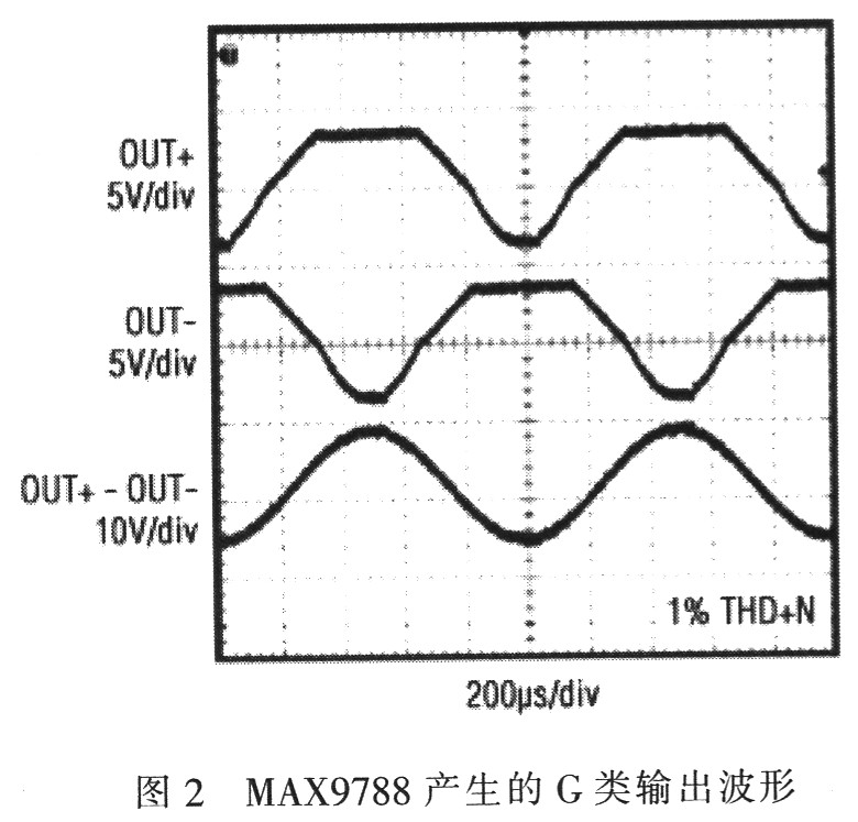 MAX9730和MAX9788可以確保在兩電源之間切換不會產(chǎn)生音頻雜音。當輸出信號達到VCC和GND供電所允許的極限時,負電源被自動連接至輸出級。這樣,輸出信號不會在負擺幅側(cè)出現(xiàn)削頂,仍箝位于其正擺幅。為了校正這一點,放大器給負極性輸出增加額外的校正信號,如圖2所示。分別觀察正、負輸出時,正半周波形被明顯削頂,而負半周存在明顯失真。盡管這些信號出現(xiàn)了嚴重的失真,但卻被嚴格控制,充分利用了該架構的優(yōu)勢。施加到負載上的實際輸出信號沒有失真。