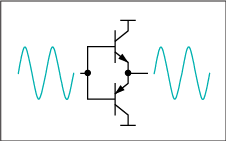 圖3. AB類(lèi)放大器將兩個(gè)晶體管偏置,使其在信號(hào)接近零時(shí)能夠?qū)。所以這類(lèi)放大器的效率比A類(lèi)放大器高,失真比B類(lèi)放大器小。