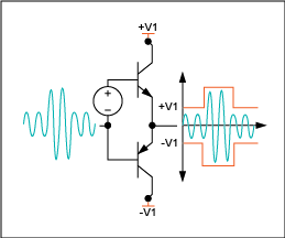 圖2 .B類(lèi)音頻放大器中,輸出晶體管僅在信號(hào)波形的半周期(180°)期間導(dǎo)通。為放大整個(gè)信號(hào),使用兩個(gè)晶體管,其中一個(gè)在正向輸出信號(hào)導(dǎo)通,另一個(gè)在負(fù)向輸出信號(hào)導(dǎo)通。
