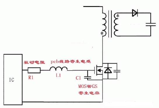 IC出來(lái)的波形正常,到C1兩端的波形就有振蕩了,實(shí)際上這個(gè)振蕩就是R1,L1和C1三個(gè)元器件的串聯(lián)振蕩引起的,R1為驅(qū)動(dòng)電阻,是我們外加的,L1是PCB上走線的寄生電感,C1是mos管gs的寄生電容。