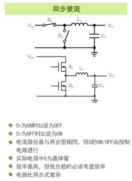 其后,筆記本電腦等電池驅(qū)動且需要較大功率的應(yīng)用開始要求更高效率,于是可獲得高效率的同步整流式開關(guān)穩(wěn)壓器用IC被陸續(xù)開發(fā),控制或電路極為復(fù)雜的同步整流式變得容易設(shè)計(jì),逐漸成為主流。同步整流式最大可以獲得近95%的效率。