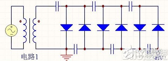 如果不帶負(fù)載,穩(wěn)態(tài)時(shí),除了最左邊的那個(gè)電容,其他每個(gè)電容上的電壓為2U,所以總的輸出電壓為6U。事實(shí)上,由于高階倍壓整流電路帶載能力很差,輸出很小的功率就會(huì)導(dǎo)致輸出電壓的大幅度跌落。假設(shè)輸出電流為I,每個(gè)電容的容量相同,為C,交流電源頻率為f,則電壓跌落為: