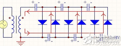 當(dāng)變壓器次級(jí)輸出為上正下負(fù)時(shí),電流流向如圖所示。變壓器向上臂三個(gè)電容充電儲(chǔ)能。