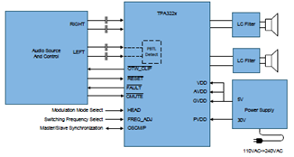 | TPA3221 100W(立體聲)200W(單路)HD音頻D類(lèi)放大器解決方案 |