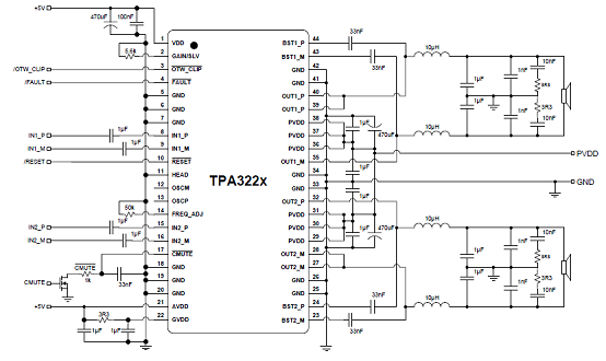 圖5.TPA3221差分(2N)AD模式PBTL應(yīng)用電路(1)