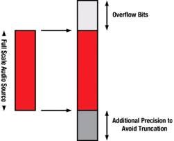 在頂端,共有 9 個位,用于防止音頻數(shù)據(jù)意外飽和。例如,如果您使用一個24-dB增壓的均衡器 (EQ),并且您輸入一個“全量程”16 位字,則您可能會非有意地讓信號飽和,也即增加失真,而這與我們努力的方向背道而馳。